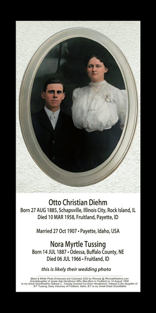 Nora Tussing Marries Otto Diehm Posted on September 19, 2022 Otto was courting Nora, and consequently moved with the Tussings from Odessa, Nebraska to Idaho in 1904-1905.