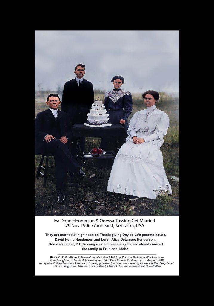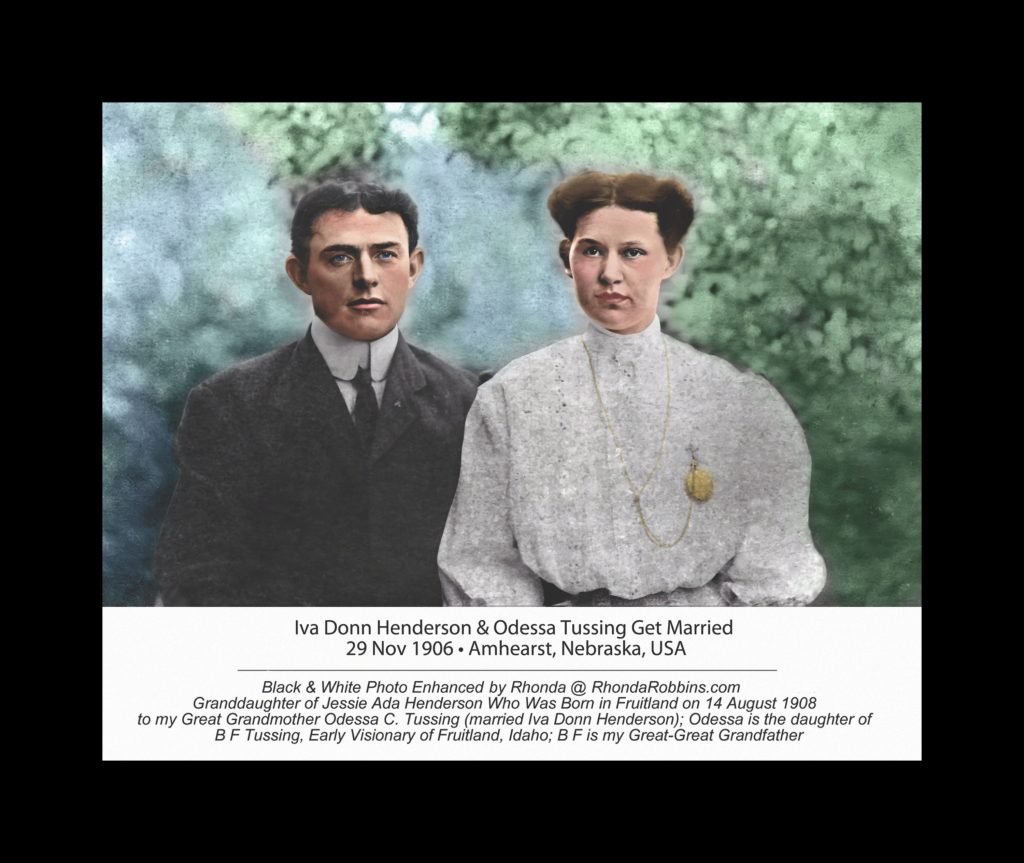 AT A BEAUTIFUL HOME WEDDING Miss Odessa Tussing Becomes the Bride of Iva Henderson. A beautiful home wedding was solemnized at the home of Mr. and Mrs. David Henderson south of Amherst at high noon on Thanksgiving Day, when their son Iva was united in wedlock to Miss Odessa Tussing of Payette. The ceremony was performed by Rev. O. S. Davis of Odessa in the presence of relatives and close friend of the couple. Miss Elsie Hanley of Lodi acted as maid of honor, and Fred Webb of Odessa was best man. The bride was gowned in white mohair trimmed with French cream colored silk Chantilly lace. Following the congratulations, a bountiful dinner was served. The groom and bride have grown to manhood and womanhood in this county and are well-known and popular. The groom is engaged in the business of a photographer. The bride is the second daughter of Mr. and Mrs. Frank Tussing, formerly residing near Odessa, but now of Payette Idaho.
